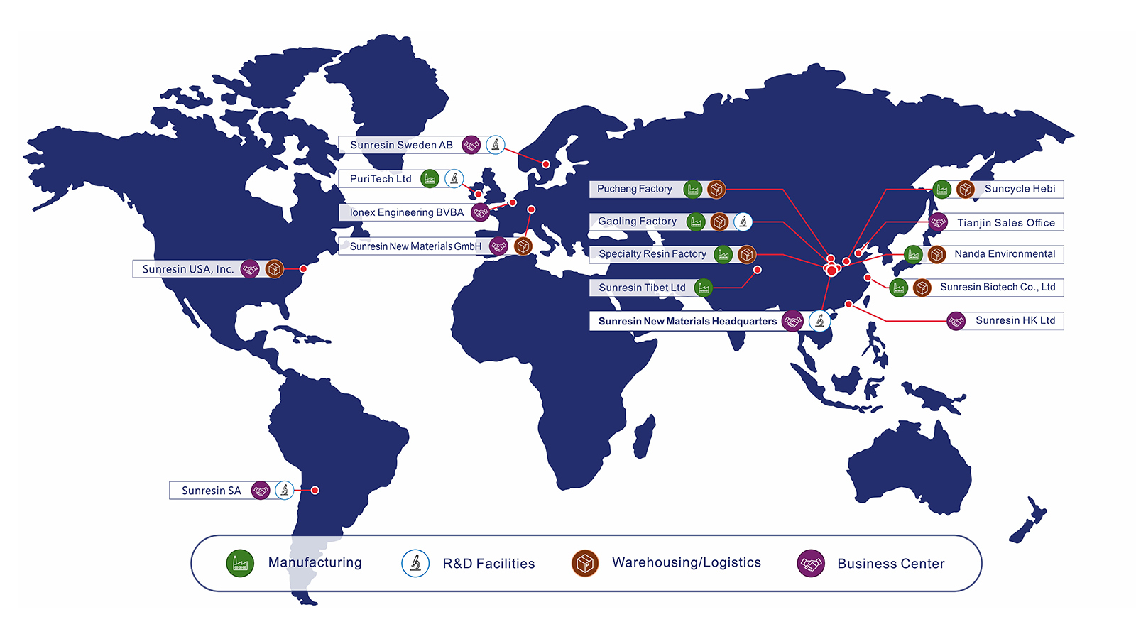 Committed to quality, Sunresin operates to ISO 9001:2015 and ISO 14001:2015 standards, with five highly-automated plants producing over 70,000 m³ annually. With a global presence spanning production facilities, business centers, R&D facilities, technical support and logistics centers across Europe, Asia, and the Americas, Sunresin is recognized for its leadership in innovation, quality, performance and supply chain security of resin technologies worldwide.